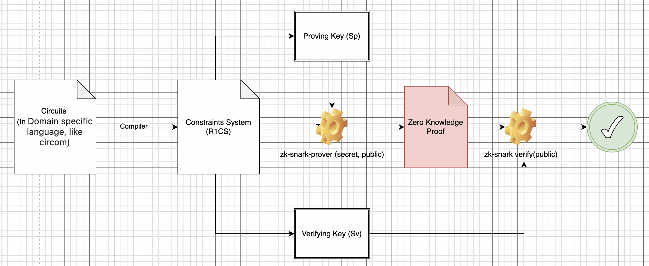 * Once we convert into SNARK friendly format (constraint system), we generate public parameters (Sp, Sv) which is feeded into SNARK prover function to generate zk-proof.&#x20;