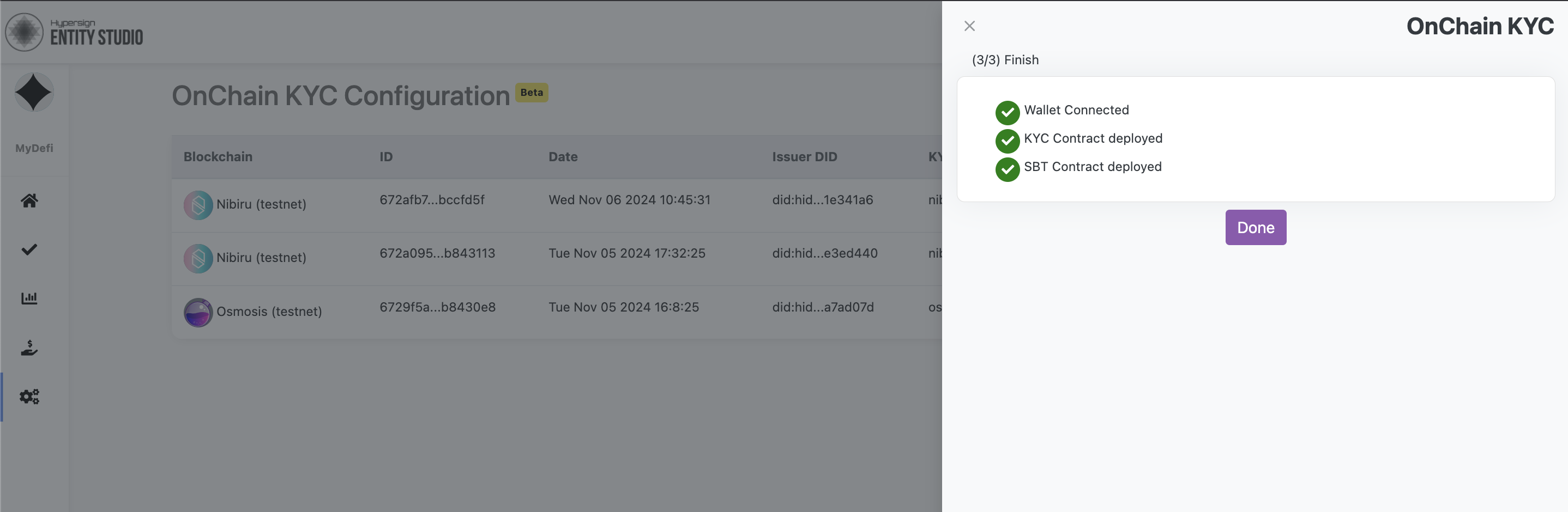 Step 1 is to deploy your KYC Issuer contract through the right slider window. Select blockchain of your choice then select a DID which you want to associate with this contract.  Finally, connect your wallet and click on "**Deploy KYC Contract**" button.&#x20;