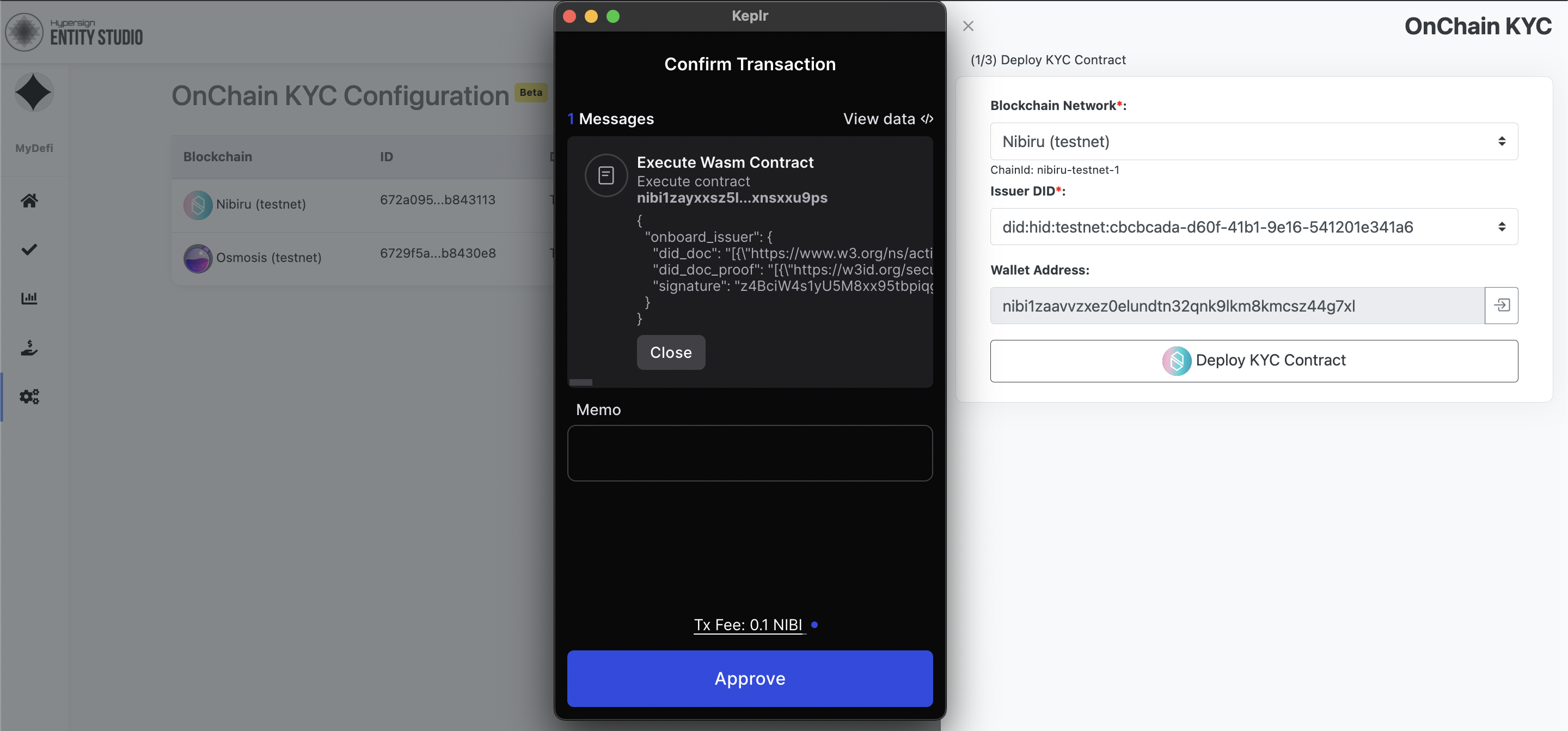 You need to authorise the transaction to instantiate your KYC issuer contract through wallet. If everything works, you will see your KYC contract address in the slider.&#x20;