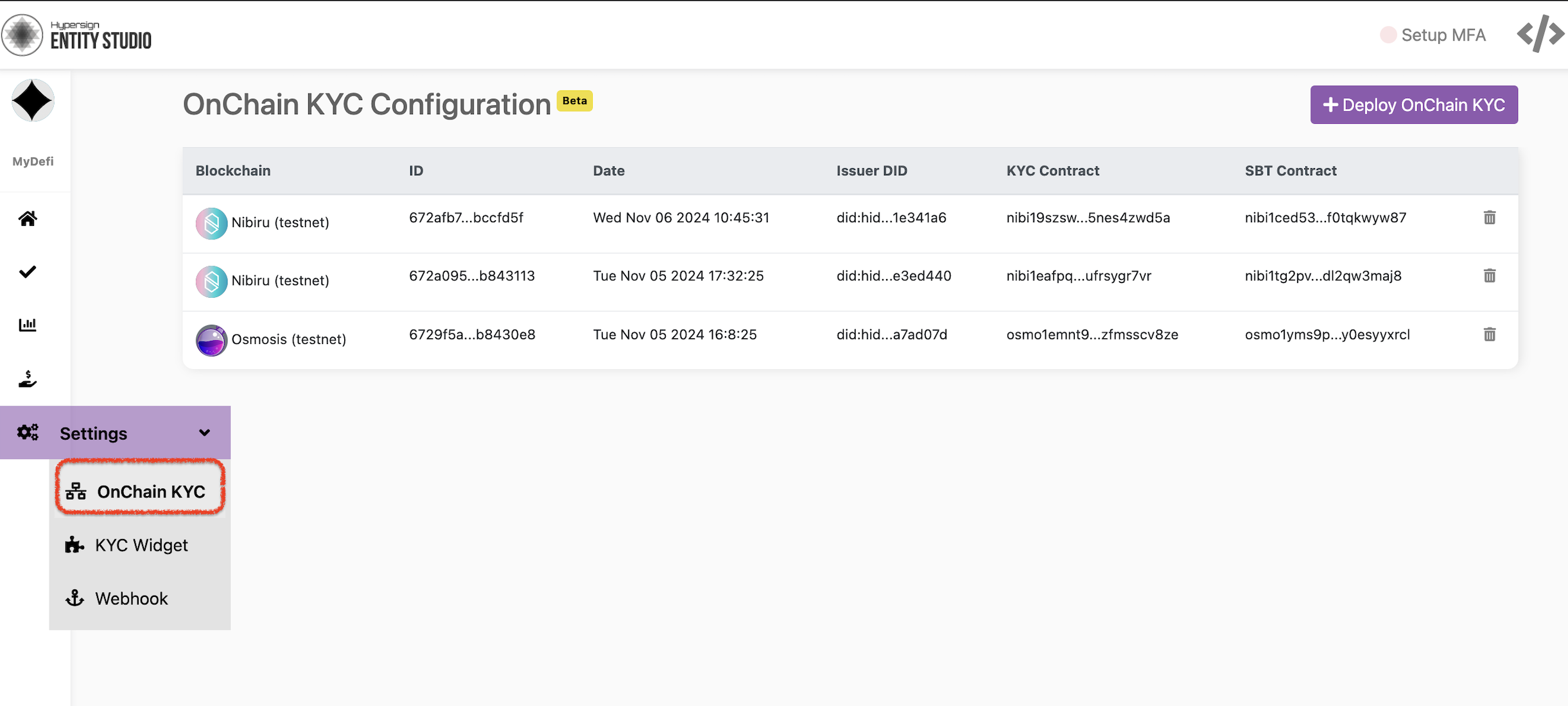 Head over to Entity Studio dashboard, choose your KYC service and click on **OnChain KYC**  under setting tab in left nav bar.&#x20;
